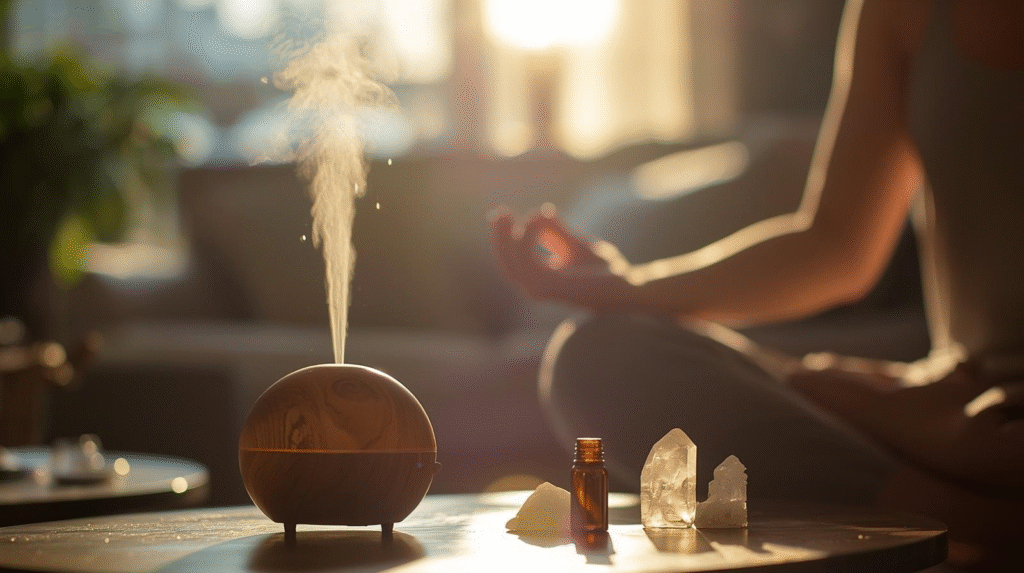 A aromaterapia utiliza óleos essenciais que possuem propriedades purificadoras, ajudando a eliminar energias pesadas e a criar um ambiente saudável.