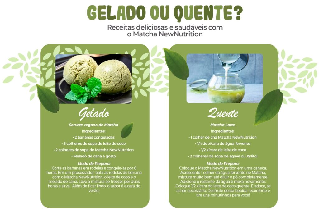 - Matcha latte – adicione leite vegetal e um toque de mel.