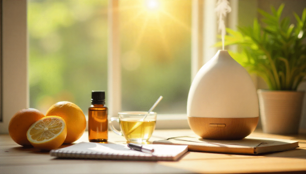 • Difusor de Aromas: Use óleos essenciais de limão ou laranja no difusor enquanto se prepara para o dia. Esses aromas energizam e estimulam a mente.