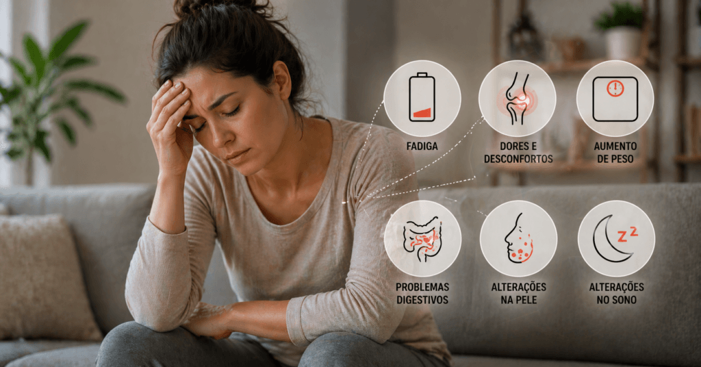 Os principais sinais incluem fadiga constante, dores e desconfortos, aumento de peso inexplicável, problemas digestivos, alterações na pele e problemas de sono.