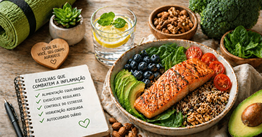 • Alimentação equilibrada: Uma dieta rica em frutas, vegetais, grãos integrais e gorduras saudáveis pode ajudar a combater a inflamação.